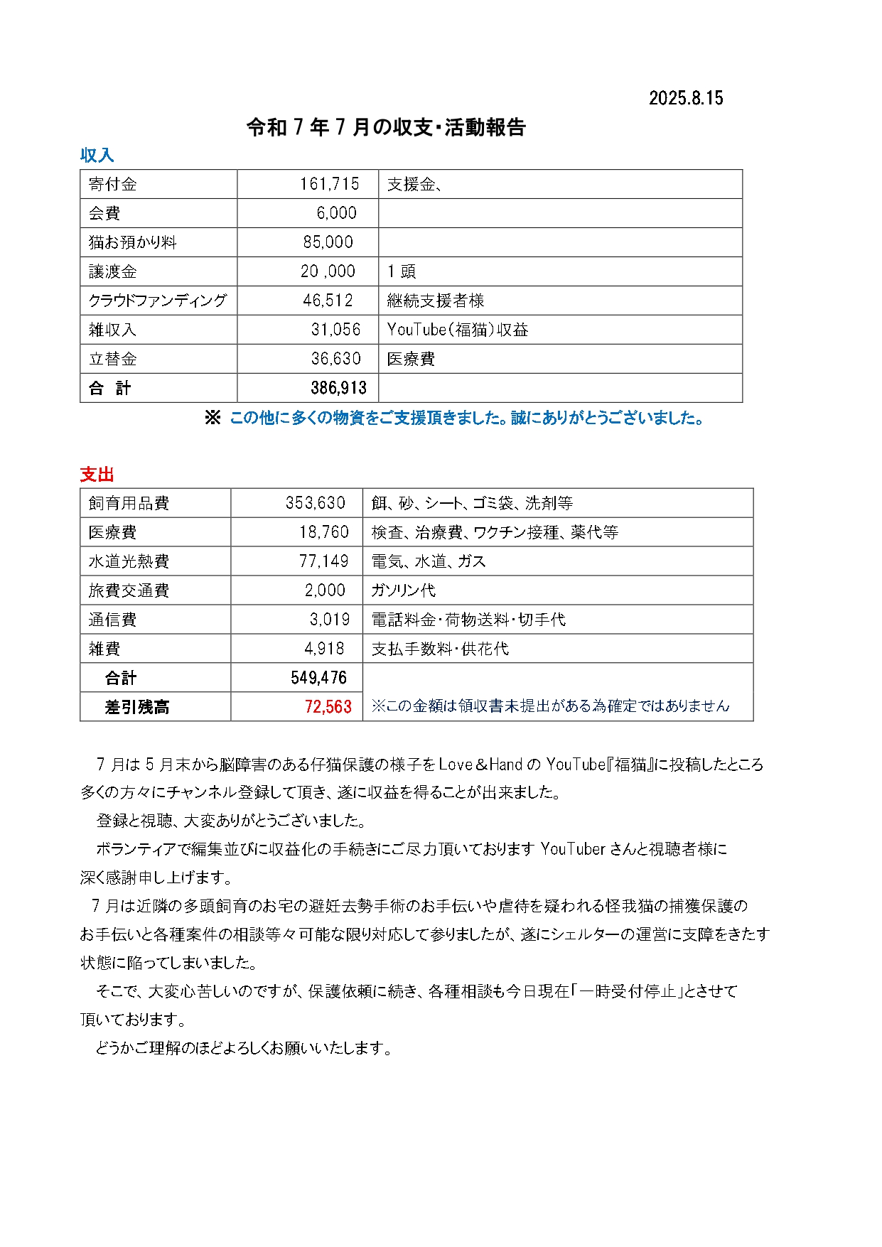 令和7年8月の収支・活動報告