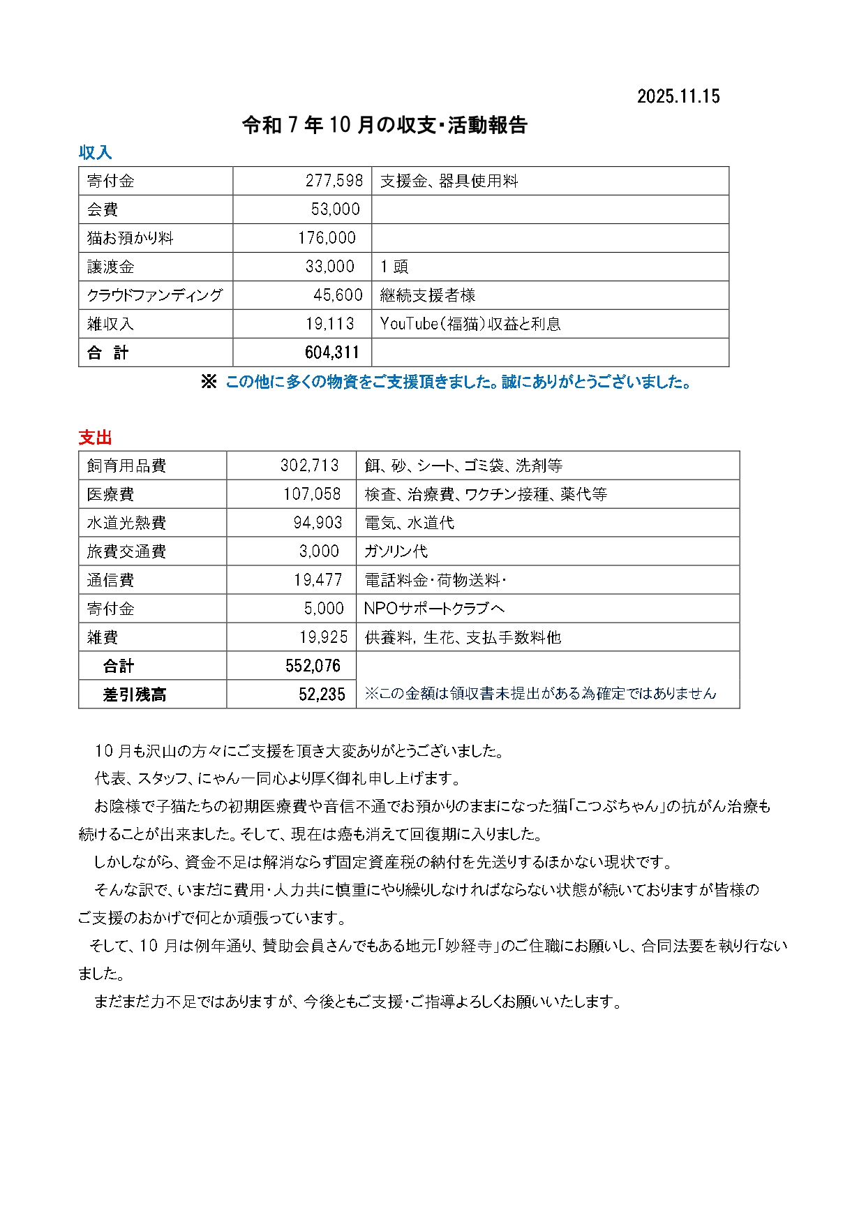 令和7年10月の収支・活動報告
